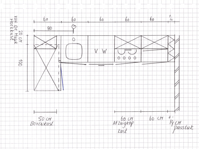 Voorbeeld van situatieschets met afmetingen (van in dit geval een keuken)