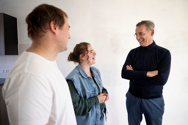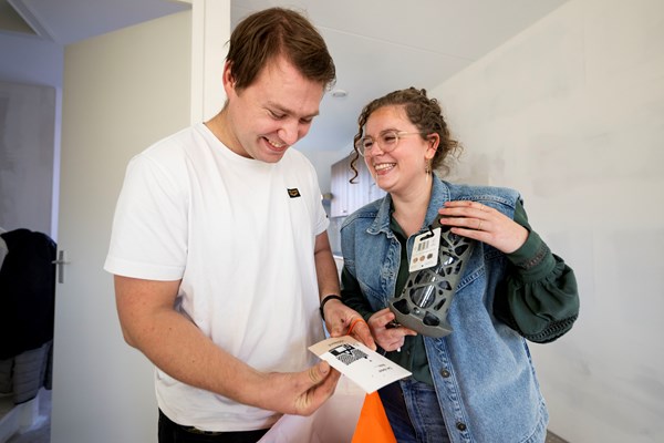 Naast de sleutels ontvangen ze een welkom cadeautje. Ook dat nemen ze met veel enthousiasme in ontvangst. En dan komt wethouder Piet Machielsen ook nog even langs. Hij krijgt een rondleiding door de woning. “Fijn dat er jonge mensen bijkomen”, zegt de wethouder. "Ik weet zeker dat jullie hier met heel veel plezier zullen wonen. Het is een prachtig project en Hilvarenbeek is een fijn dorp, waar veel georganiseerd wordt".